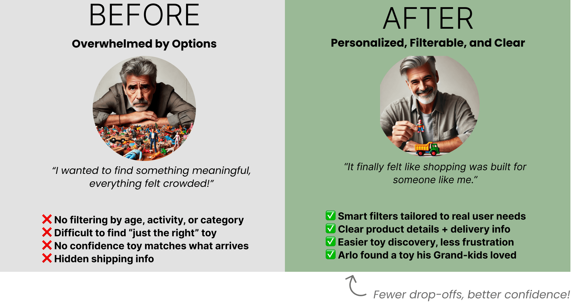 That’s exactly what Arlo experienced. As a grandfather who loves picking out gifts for his grandkids, he found himself overwhelmed—struggling to find the right toy, filtering through too many options, and feeling unsure if what he ordered would actually match what arrived.