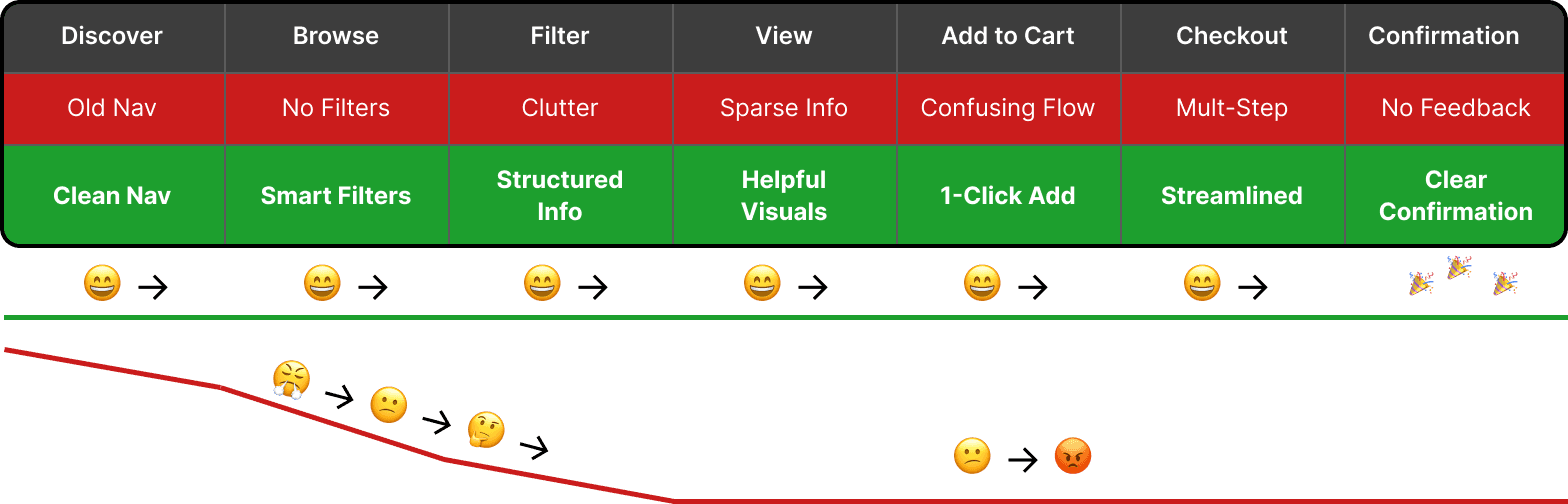 To highlight the UX improvements made during the Dinosaur Farm e-commerce redesign, I mapped out the full product purchase journey—from discovering the site to confirming a successful order. This diagram compares the original experience (in red) with the redesigned experience (in green), showing how friction was removed and clarity added across the entire flow.