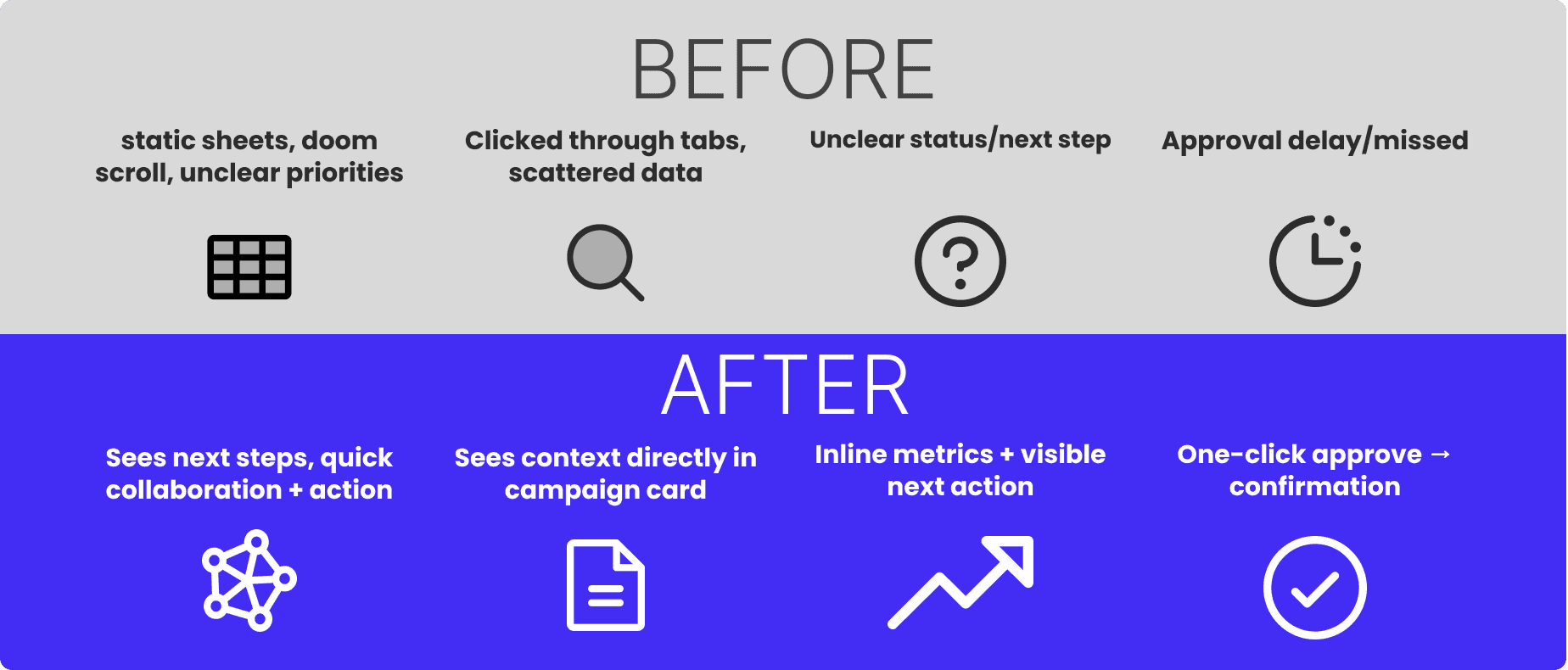 ✔ Marketers were drowning in fragmented data → Spending 30% more time manually approving campaigns instead of optimizing them.